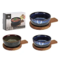 Set pentru aperitiv EH 2unitati 16X10cm Materiale: Ceramica (pentru boluri/recipiente) și Bambus (pentru suport/tavă).Bambusul este un material sustenabil, rezistent la umiditate și cu proprietăți antibacteriene naturale. Configurație: Set format din 2 unități Dimensiuni Totale: 16 X10cm . Finisaj: Glazură ceramică fină (ușor de curățat) și lemn de bambus tratat pentru uz alimentar.