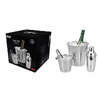 Rasfata-te pe tine si pe cei dragi cu acest minunat set pentru bar profesionisti. Aici veți găsi o găleată pentru răcirea șampaniei și un recipient cu gheață și chiar un agitator pentru prepararea cocktail-urilor. Pe scurt, tot ce ai nevoie de sarbatori! Setul este format din 4 articole: o găleată pentru băuturi răcoritoare, o găleată mică și clești pentru gheață, un agitator. Toate produsele sunt fabricate din oțel de înaltă rezistență. Domeniul de aplicare Setul de bar 4 articole este destinat pentru prepararea și răcirea băuturilor, furnizarea de gheață la o masă. Acest set va fi un cadou grozav de sărbători. - Set practic si functional. - Obiectele din otel sunt rezistente la deteriorare si coroziune. - Produsele va vor bucura mulți ani. Setul include o găleată mare pentru gheață (aproximativ 22 cm în înălțime și 21,5 cm în diametru), o găleată mică pentru gheață (aproximativ 13 cm în înălțime și 14 cm în diametru), un shaker pentru cocktailuri de 500 ml cu filtru și capac (aproximativ 20,5 cm în înălțime și 9,5 cm în diametru) și clești pentru gheață (aproximativ 14,5 cm în lungime).